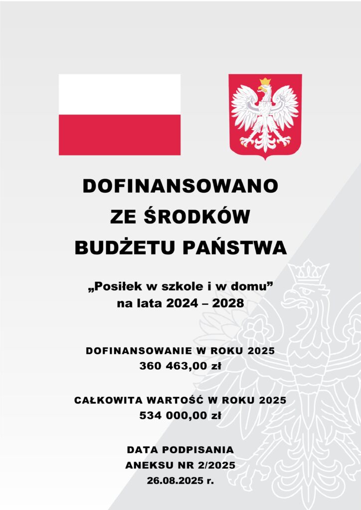 plakat informacyjny dotyczący dofinansowania ze środków budżetu państwa programu "Posiłek w szkole i w domu" - aneks nr 1/2025 z dnia 03.06.2025 roku