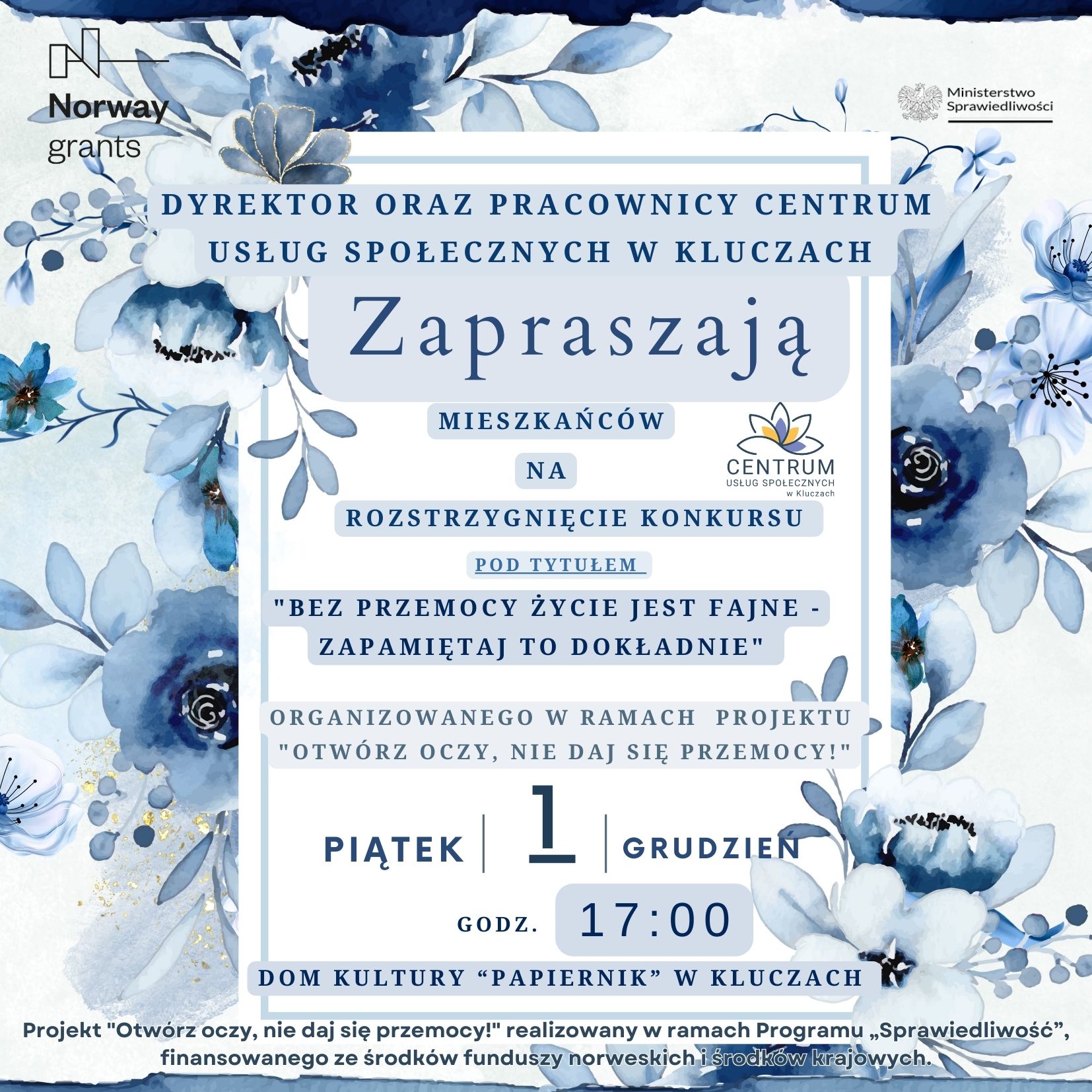 22 listopada 2023W imieniu Pani Dyrektor Iwony Kocjan oraz pracowników Centrum Usług Społecznych w Kluczach chcielibyśmy serdecznie zaprosić mieszkańców Gminy Klucze na rozstrzygnięcie konkursu „Bez przemocy życie jest fajne, zapamiętaj to dokładnie” organizowanego w ramach projektu „Otwórz oczy, nie daj się przemocy!”.